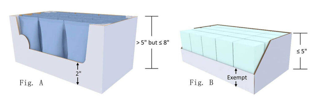 - For product that is single stacked with a height greater than 5″/12 cm but less than or equal to 8″/20 cm, the minimum front tray height may be reduced to 2″/5 cm, as long as the remaining three sides are a minimum of 4″/10 cm (Fig. A).