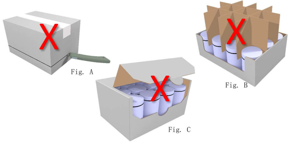 Tear front panels (Fig. C), plastic strapping, tear tape, telescoping lids, and tray covers are not allowed.